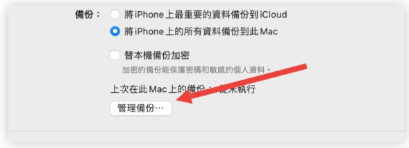 如果你想要快速的查看iPhone 备份到电脑的档案存在哪里,你可以点选Finder 里面的「管理备份」这个按钮。