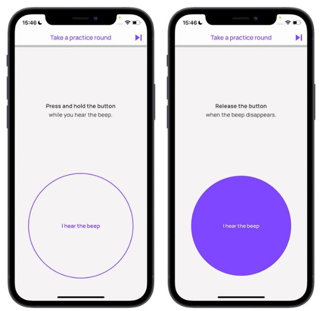 在开始测量之前,系统会让你练习听力测量的方式,当你听到哔哔哔的声音就按住画面中的按钮,然后声音会越来越小声,当你觉得哔哔哔的声音消失后就放开,整个测量的方式就是这样。