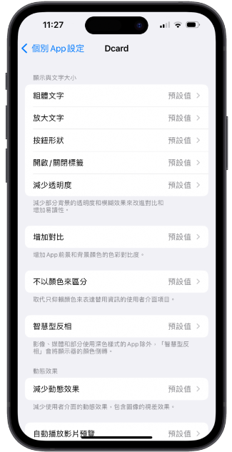最后点击Dcard 就可以自由设置Dcard 这一个App 的显示方式,包含粗体文字、字体大小、按钮形状、标签显示等等都可以调整。